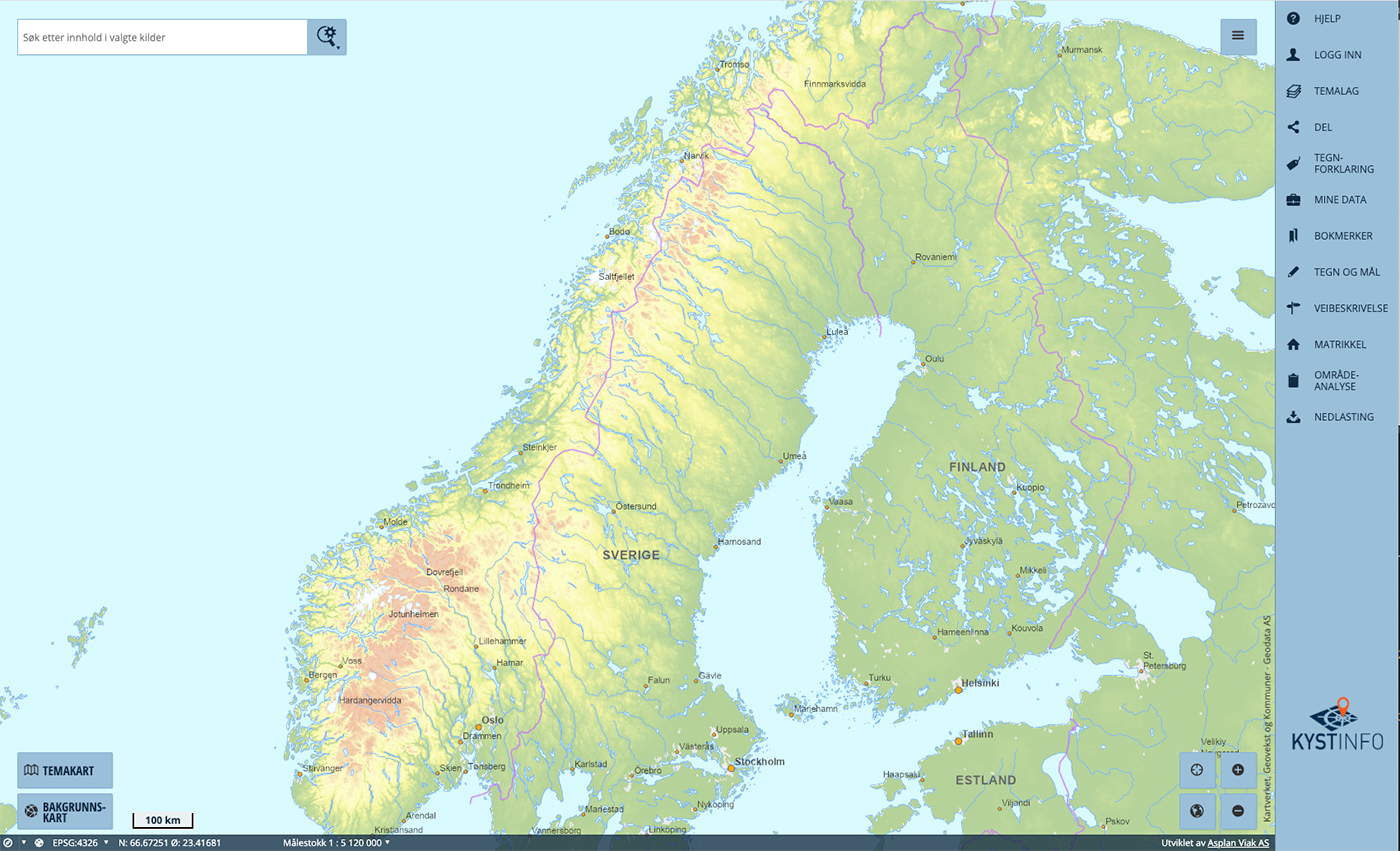 KYSTINFO is a web based layered sea-map system where many different layers with information can be activated and updated real-time by the coastal administration, its partners, and registered users. Many layers are freely available by default, some examples are navigational installations, anchorage areas, harbours, marine charts, depth maps, real-time and historical AIS vessel data, hazardous areas, accident frequency and meteorological data (wind, wave hight and direction, precipitation, currents). The tool can be accessed here.